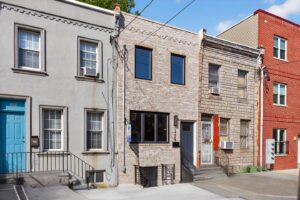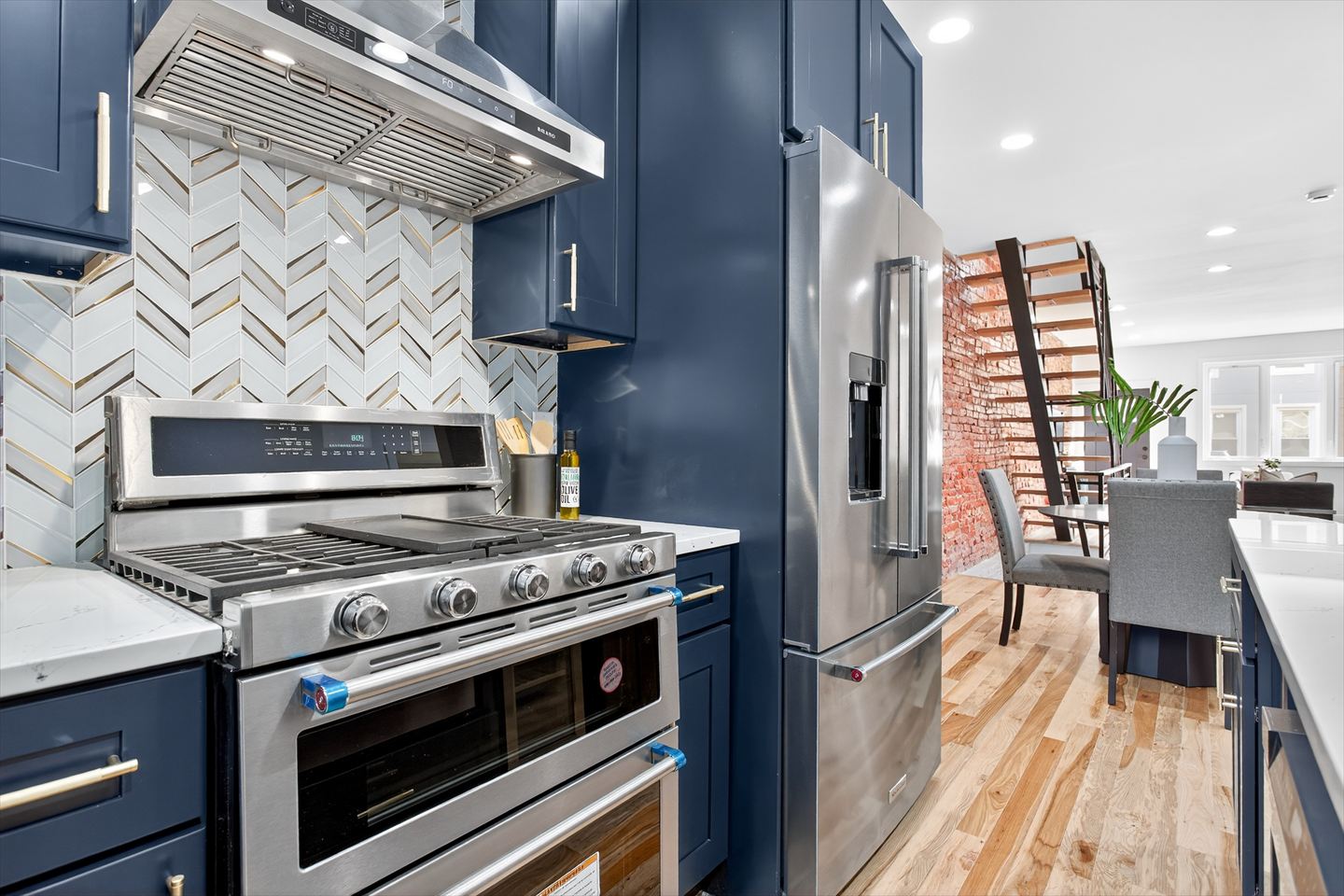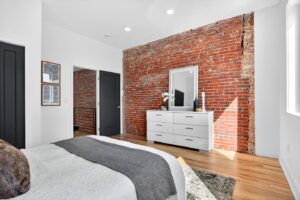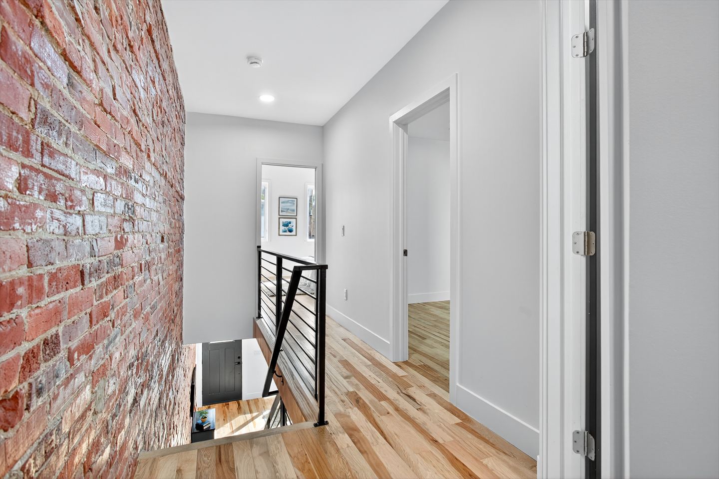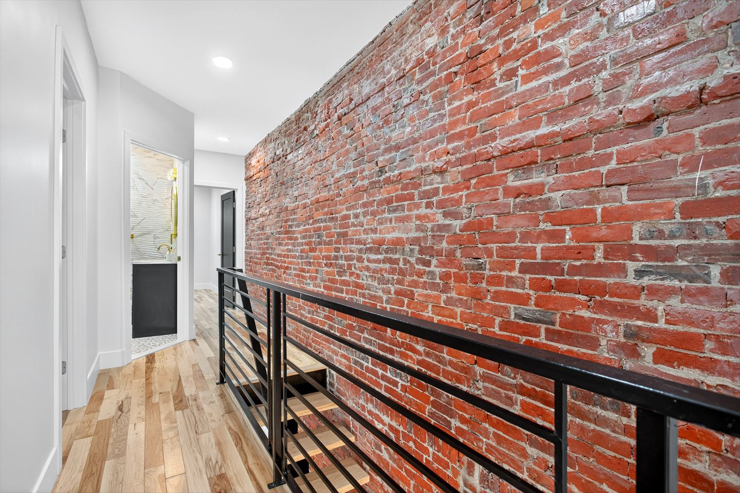 The modern kitchen includes a center island, built-in wine cooler, and high-end KitchenAid appliances. Upstairs, you’ll find three well-appointed bedrooms and a stylish full bathroom. The spacious primary bedroom offers large windows and exposed brick, creating a cozy yet airy atmosphere. The back bedroom includes a generous closet and great natural light, while the middle room is ideal for a home office, study, or playroom.