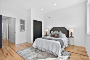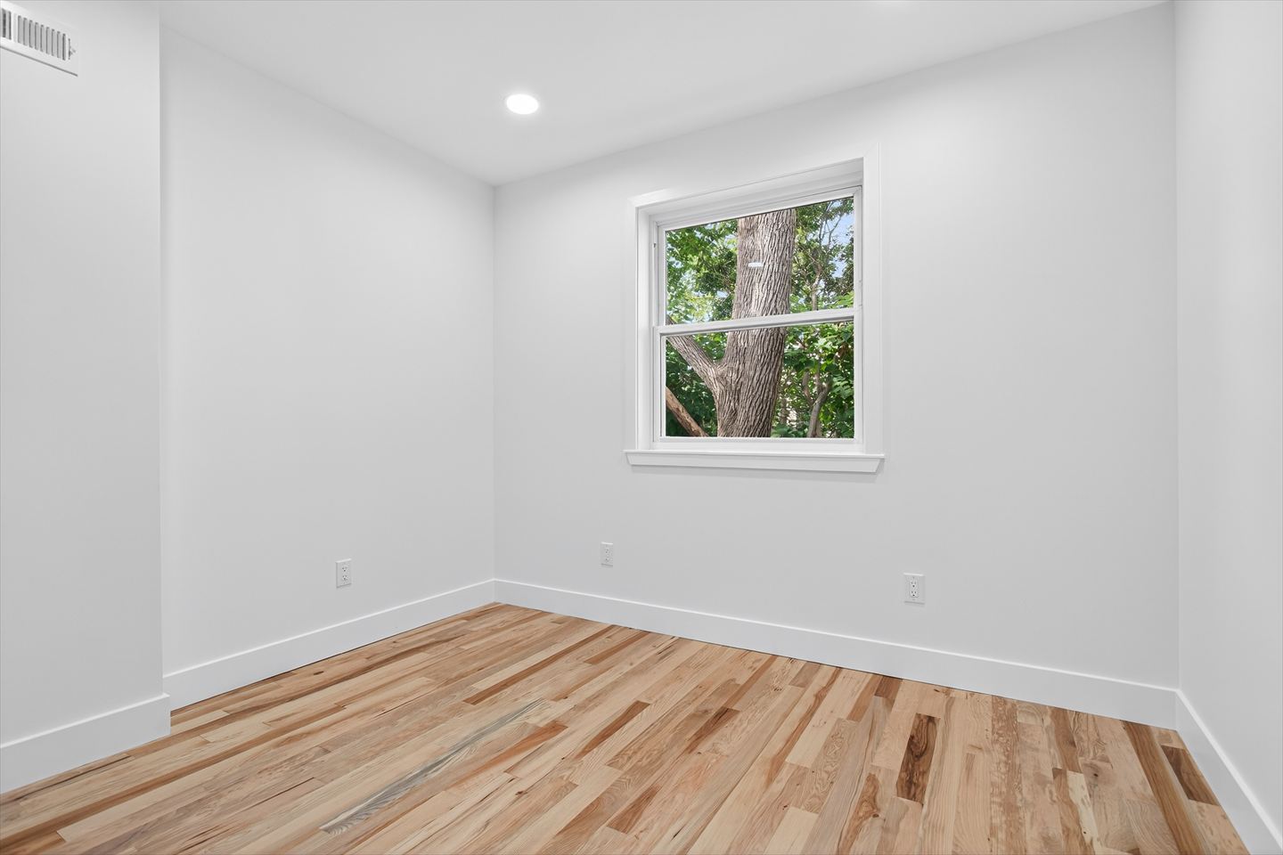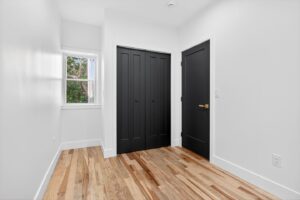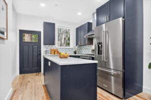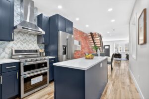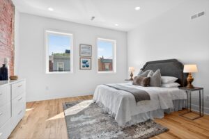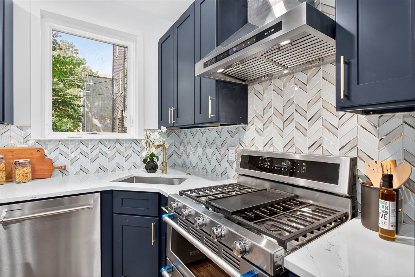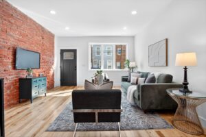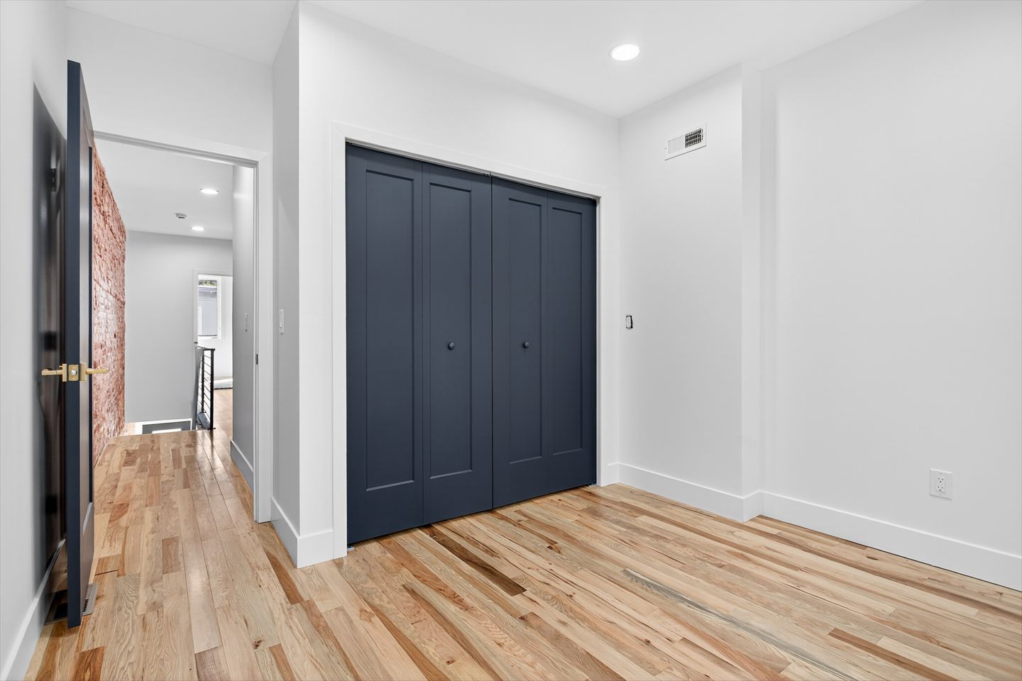 The modern kitchen includes a center island, built-in wine cooler, and high-end KitchenAid appliances. Upstairs, you’ll find three well-appointed bedrooms and a stylish full bathroom. The spacious primary bedroom offers large windows and exposed brick, creating a cozy yet airy atmosphere. The back bedroom includes a generous closet and great natural light, while the middle room is ideal for a home office, study, or playroom.