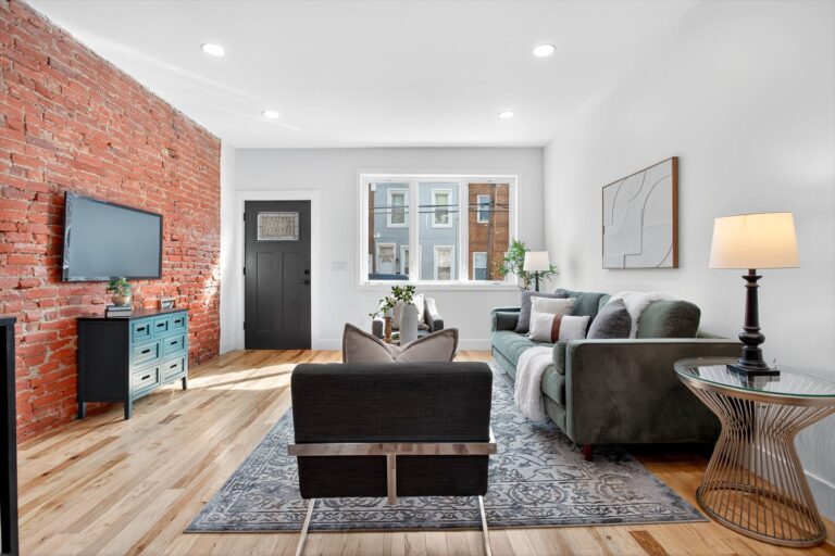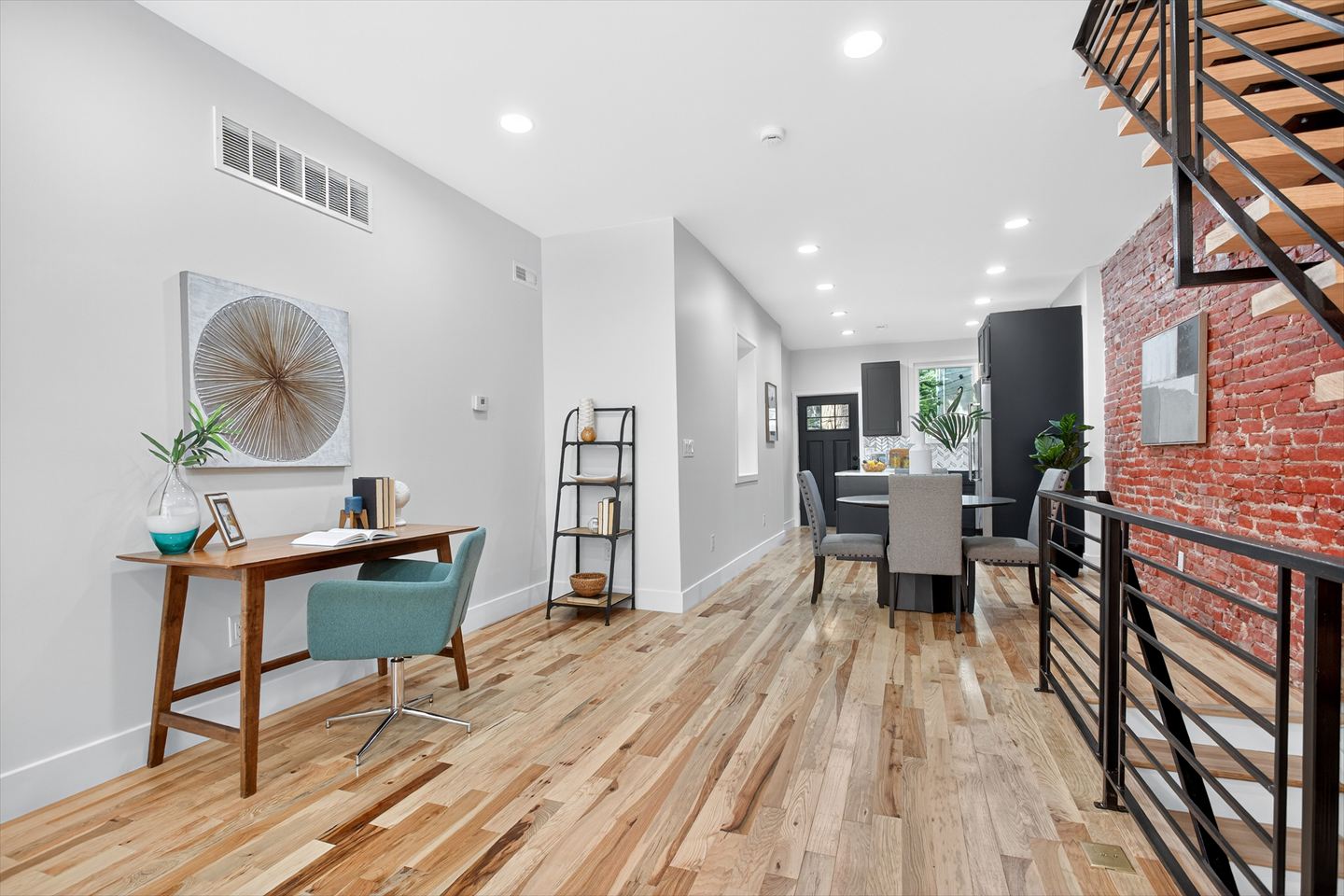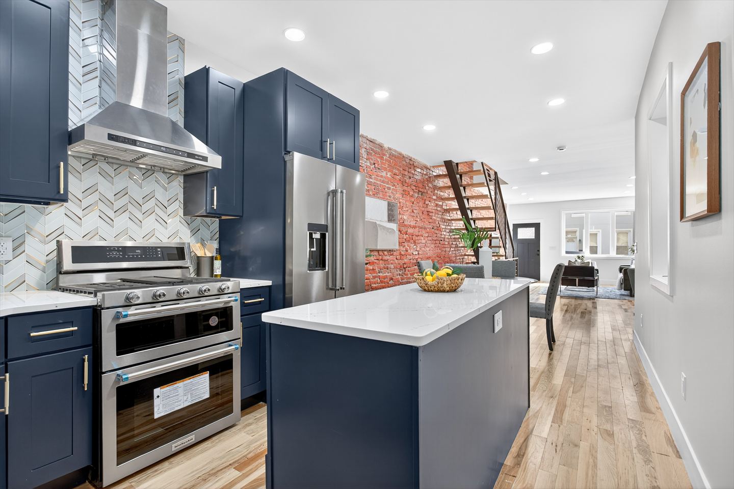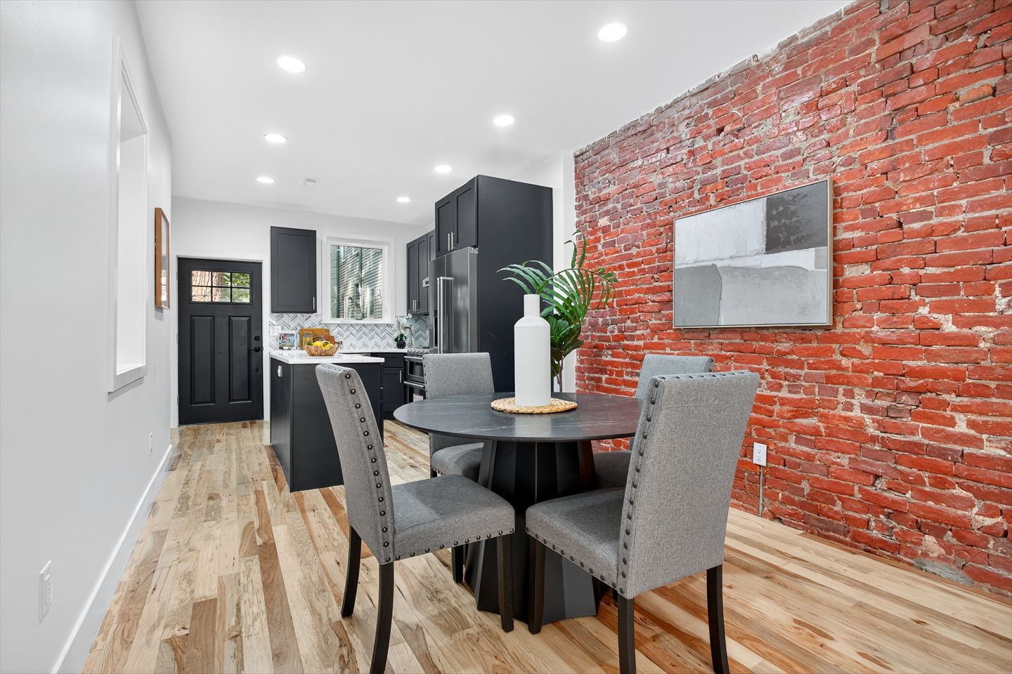 Welcome to this beautifully renovated home located in the vibrant Grays Ferry neighborhood, just steps from Washington Avenue. The main level features an open-concept layout with a bright living and dining area, highlighted by exposed brick walls that add warmth and urban character.