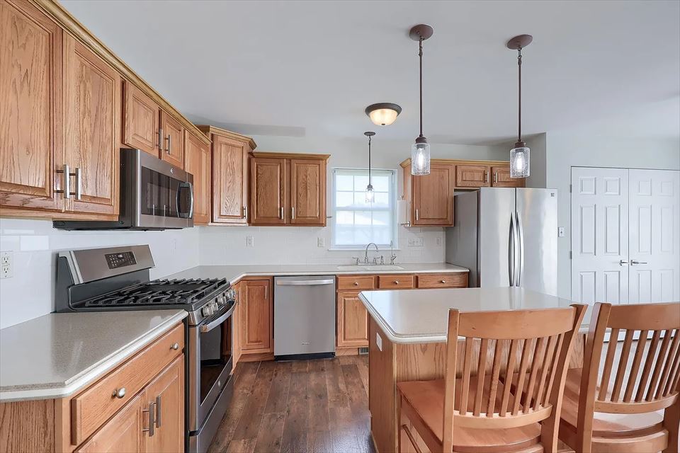 The layout features a separate dining room, spacious living room, and a kitchen with island, dining area, and stainless steel appliances. Natural gas heat and central air provide year-round comfort. A convenient first-floor laundry and attached two-car garage add to the everyday ease of living.