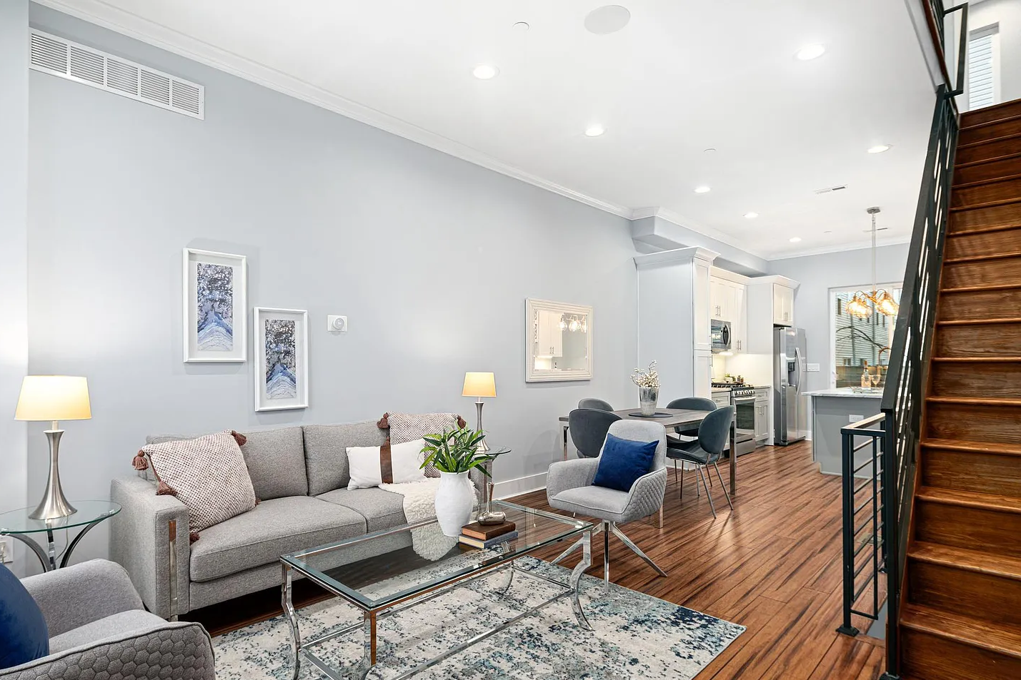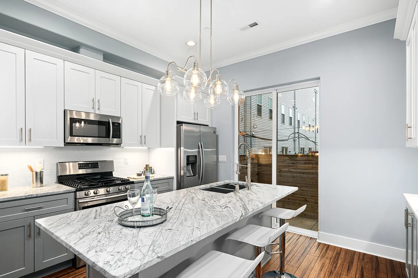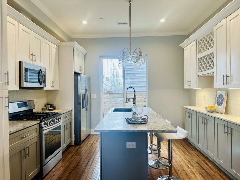 Inside, the contemporary open floor plan was complemented by hand-scraped hardwood floors, elegant crown molding, and custom millwork throughout. The heart of the home featured a state-of-the-art kitchen designed for both everyday living and entertaining, complete with a wide island and breakfast bar, high-end Samsung stainless steel appliances, soft-close Shaker-style cabinetry, and solid stone countertops.