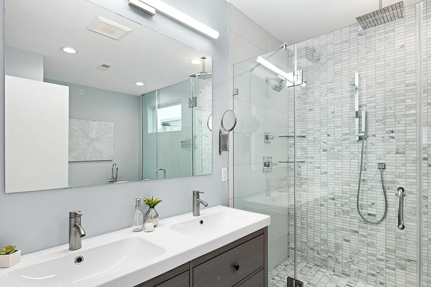 The bathrooms reflected a spa-like experience, appointed with imported porcelain and marble tile, seamless glass shower enclosures, modern freestanding tubs, and rainfall shower heads. The primary suite served as a private retreat, offering an extra-large bedroom with a bay window and a generous oversized closet.