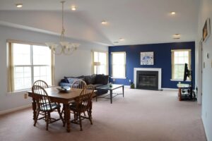 On the main living level, a generous living and dining combination room showcased a cathedral ceiling with accent lighting and a gas fireplace, creating a warm and inviting central gathering space. Sliding access led to a covered deck overlooking open community green space and mature trees, offering an impressive sense of privacy for an end-unit setting.