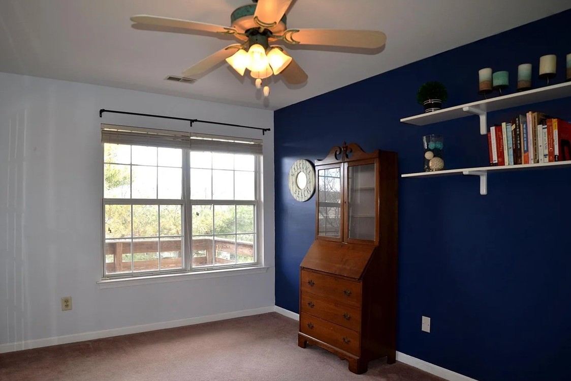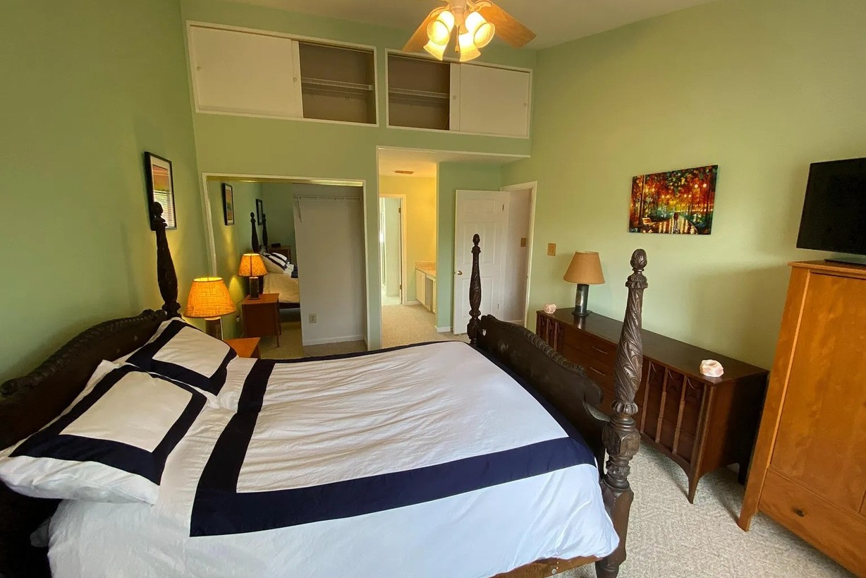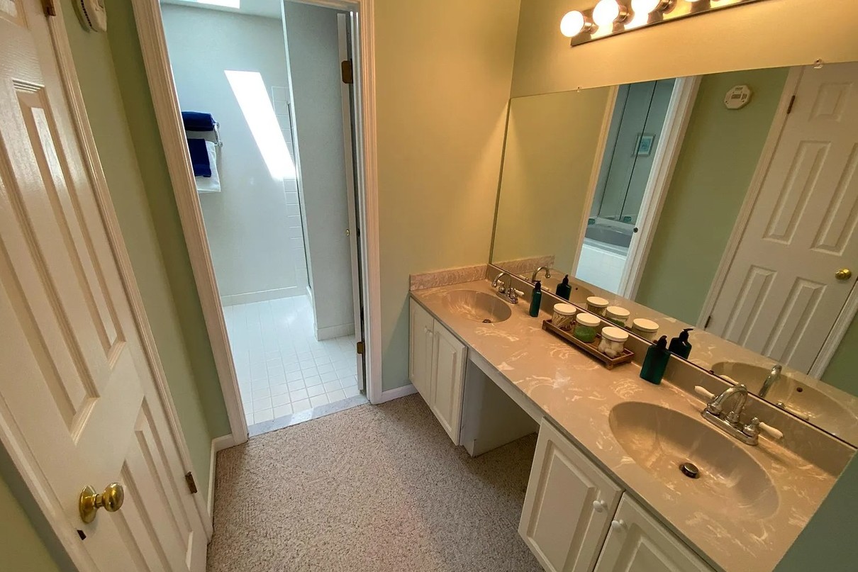 A third bedroom was located directly off the living room with double windows facing the deck and a ceiling fan. The primary suite featured a vaulted ceiling, double closet, two overhead storage closets, and a separate dressing area with vanity and sink. The primary bathroom offered a whirlpool tub, stall shower, ceramic tile flooring, and a skylight. A hall bath with tub/shower completed the level.